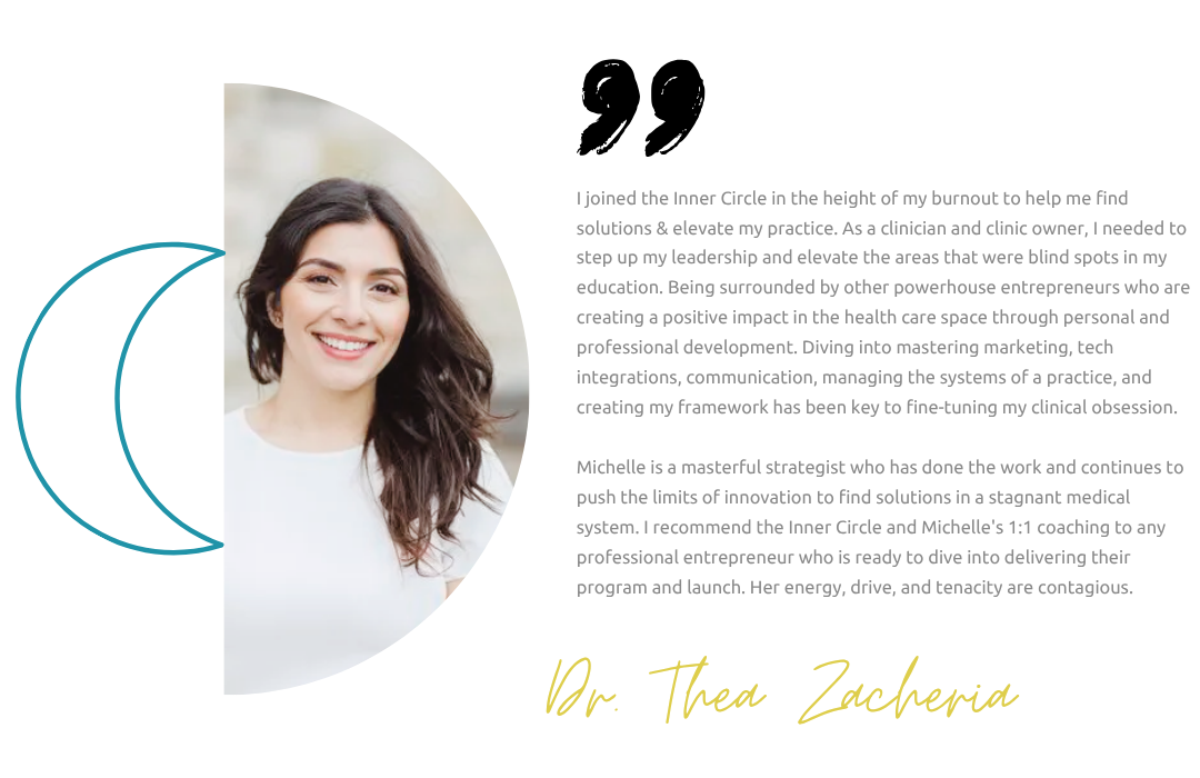 - Inconsistent results: You know you were meant for more. You LOVE seeing your patients get results, transform in their health and you recognized the limitations to be able to do that in a 1:1 capacity, You want to impact more people and do it in a way that gets results AND honours your energy and enjoyment.